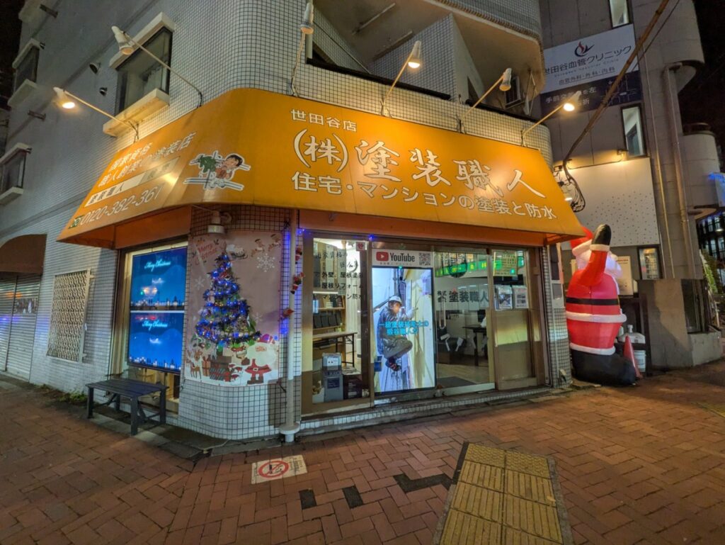今年も世田谷の塗装職人東京店に、クリスマスの象徴ともいえる大きなサンタクロースと季節の装飾がお目見えしました。